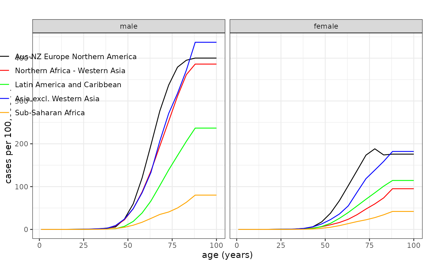Northern Africa - Western Asiaa list object of 18 items, each of which contains a data.frame of cancer rates (see Details)