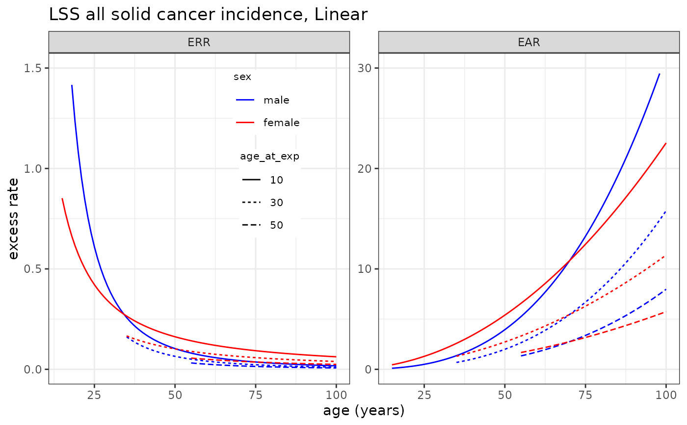 plot_riskmodel( rm=LSS_incidence$allsolid$L, title="LSS all solid cancer incidence, Linear", leg_pos=c(0.4, 0.95) )
