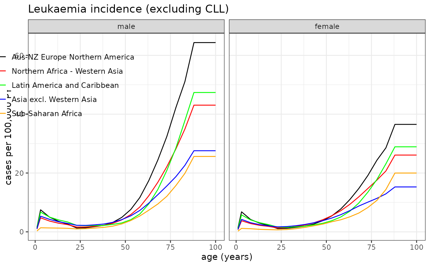 plot_refdata( dat=Incidence, outcome="leukaemia", title="Leukaemia incidence (excluding CLL)", leg_pos=c(0.27,0.95), y_lab="cases per 100,000 PY" )